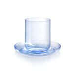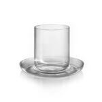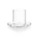 Skleněné šálky na flat white z kolekce Drop s podšálky inspirovanými jemným zvlněním hladiny kávy při dopadu kapky. Minimalistické šálky podtrhují čistotu materiálu, zatímco podšálky dodávají celku vizuální dynamiku.
